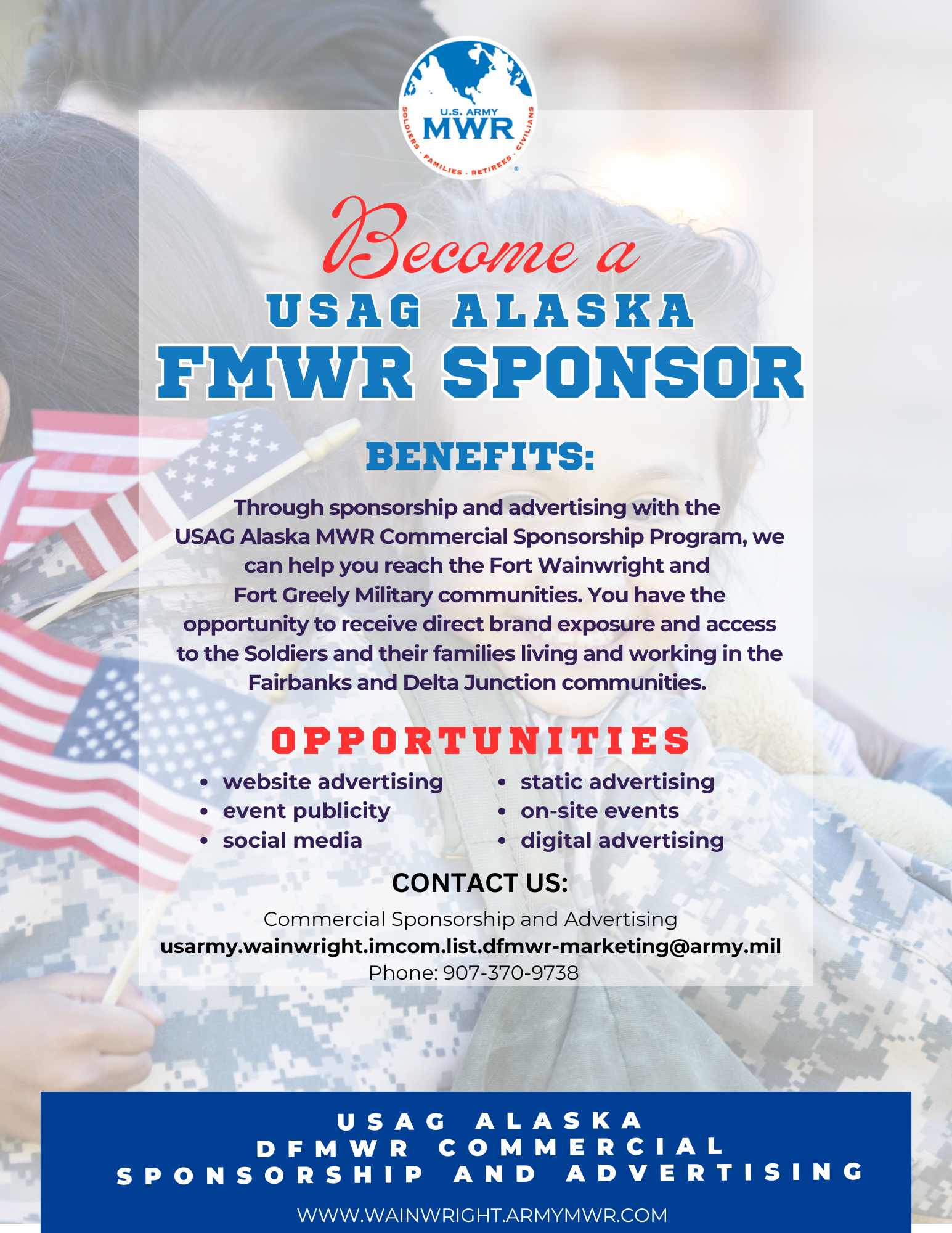 If you have any questions, please contact the Commercial Sponsorship & Advertising Office directly by email: nicole.l.shaffer10.naf@army.mil or phone: 907-370-9738.