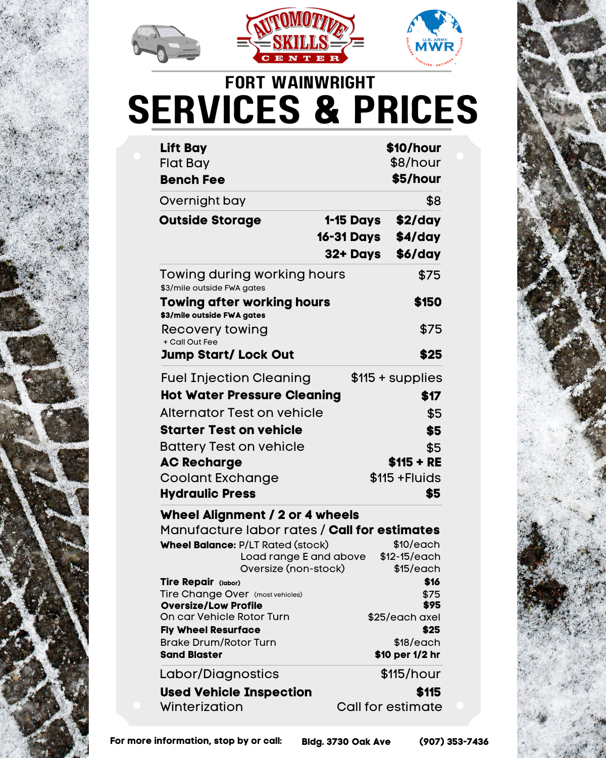 Taking care of your vehicle can be a challenge with the extreme Alaskan weather. Let the knowledgeable staff at the Automotive Skills Center make your time in Alaska better by assisting you in making repairs at prices lower than you will receive off post.