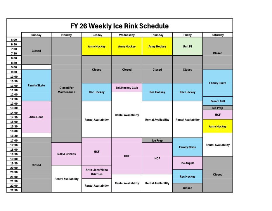In addition to scheduled hockey games and events, open skate times are available throughout the week. Lessons are also available by registering through the PFC.