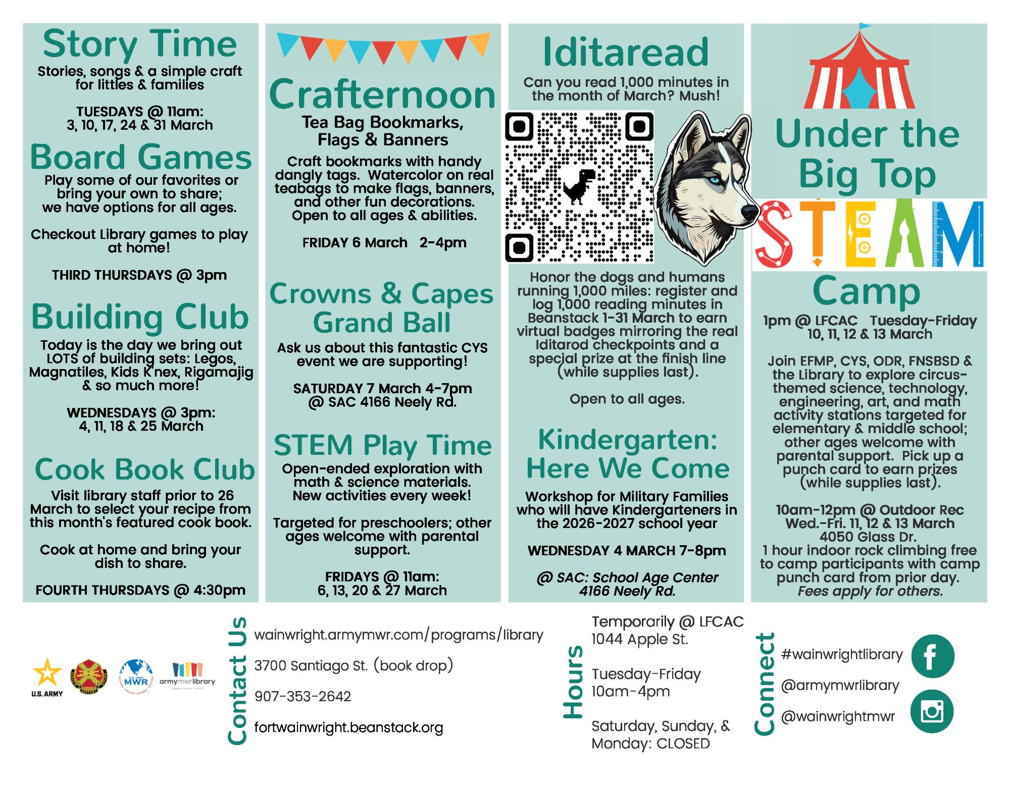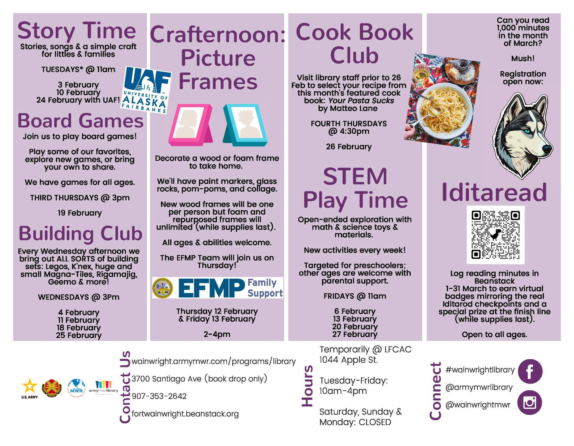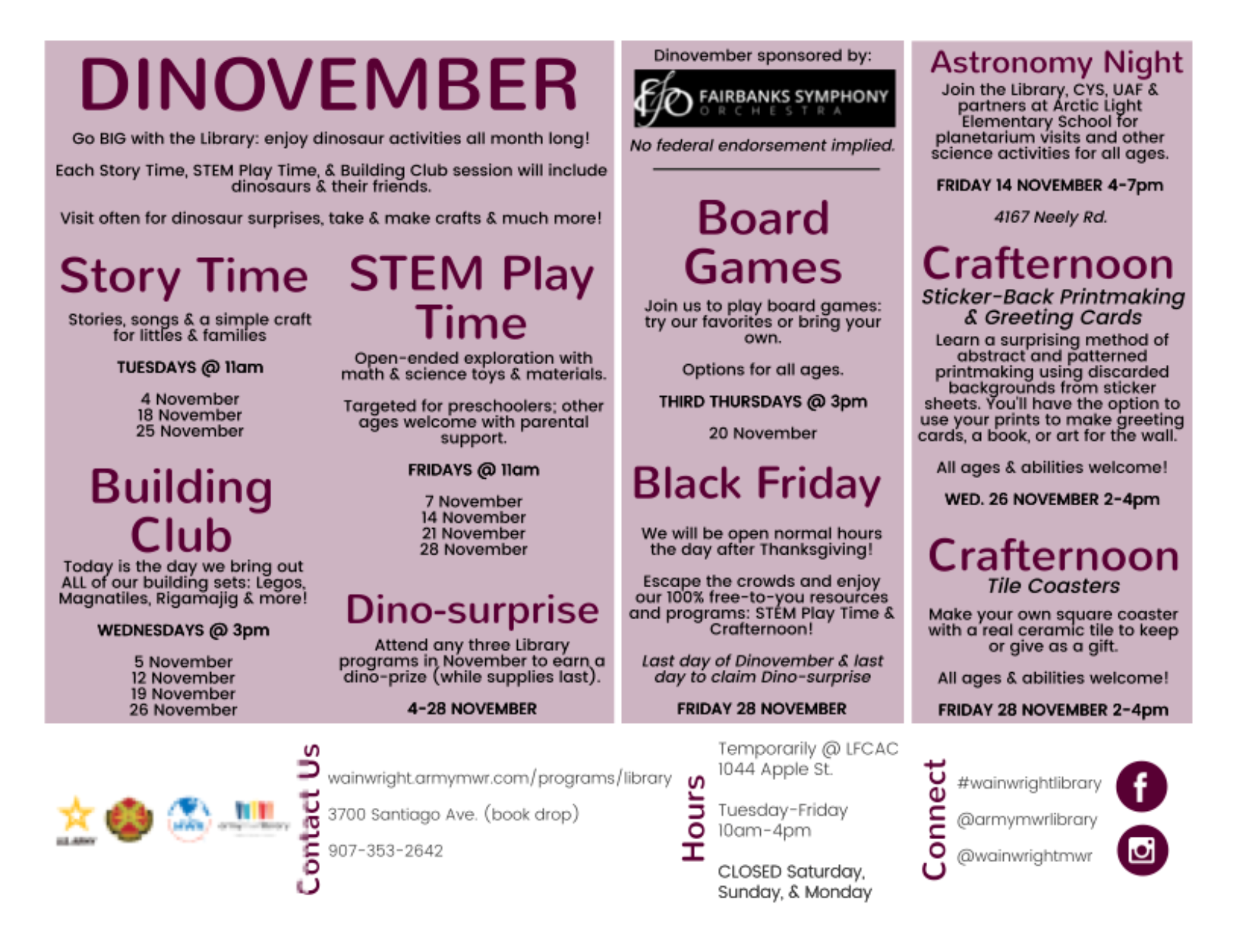 Please check out the MWR Calendar https://wainwright.armymwr.com/calendar for any changes to this calendar or updated information regarding the events listed here.