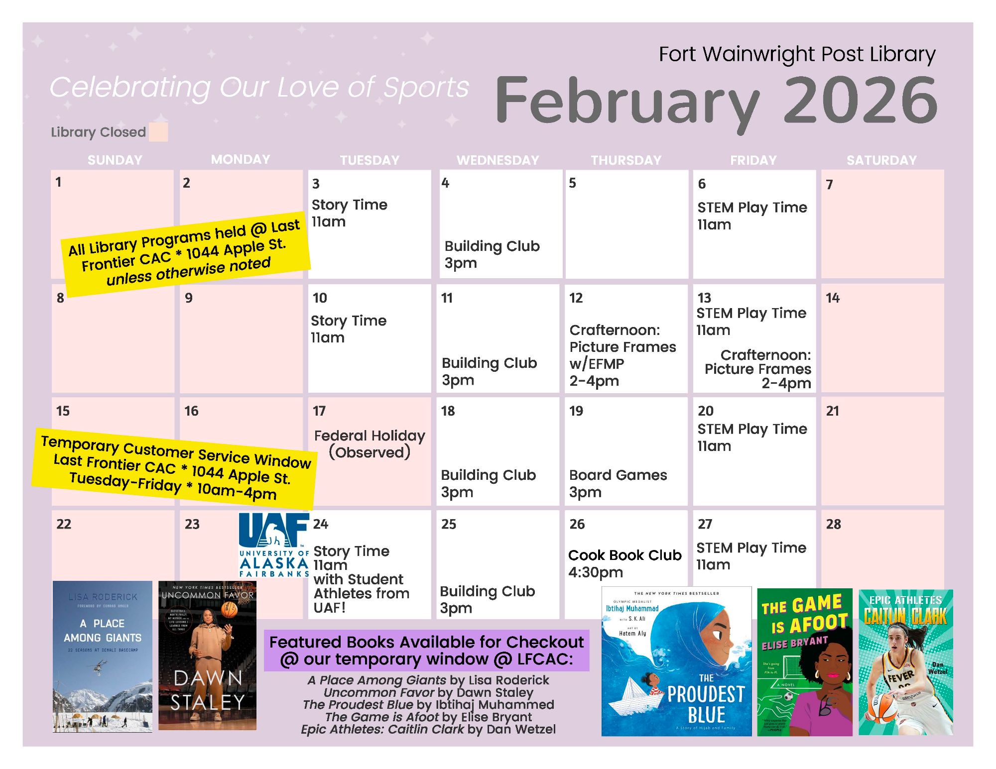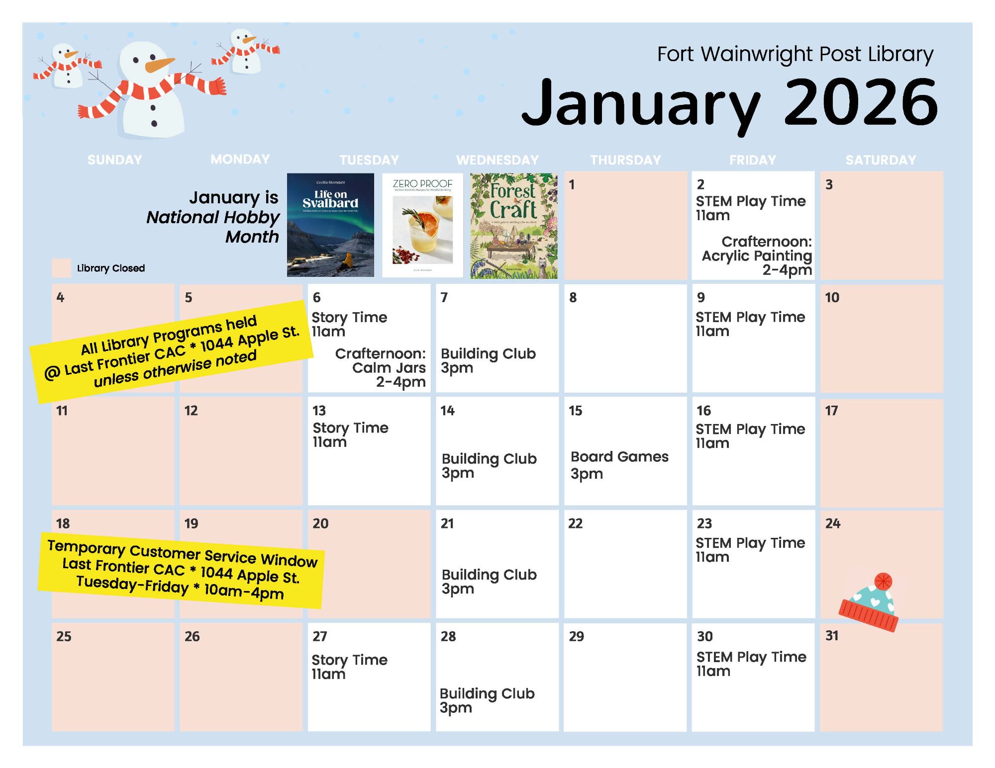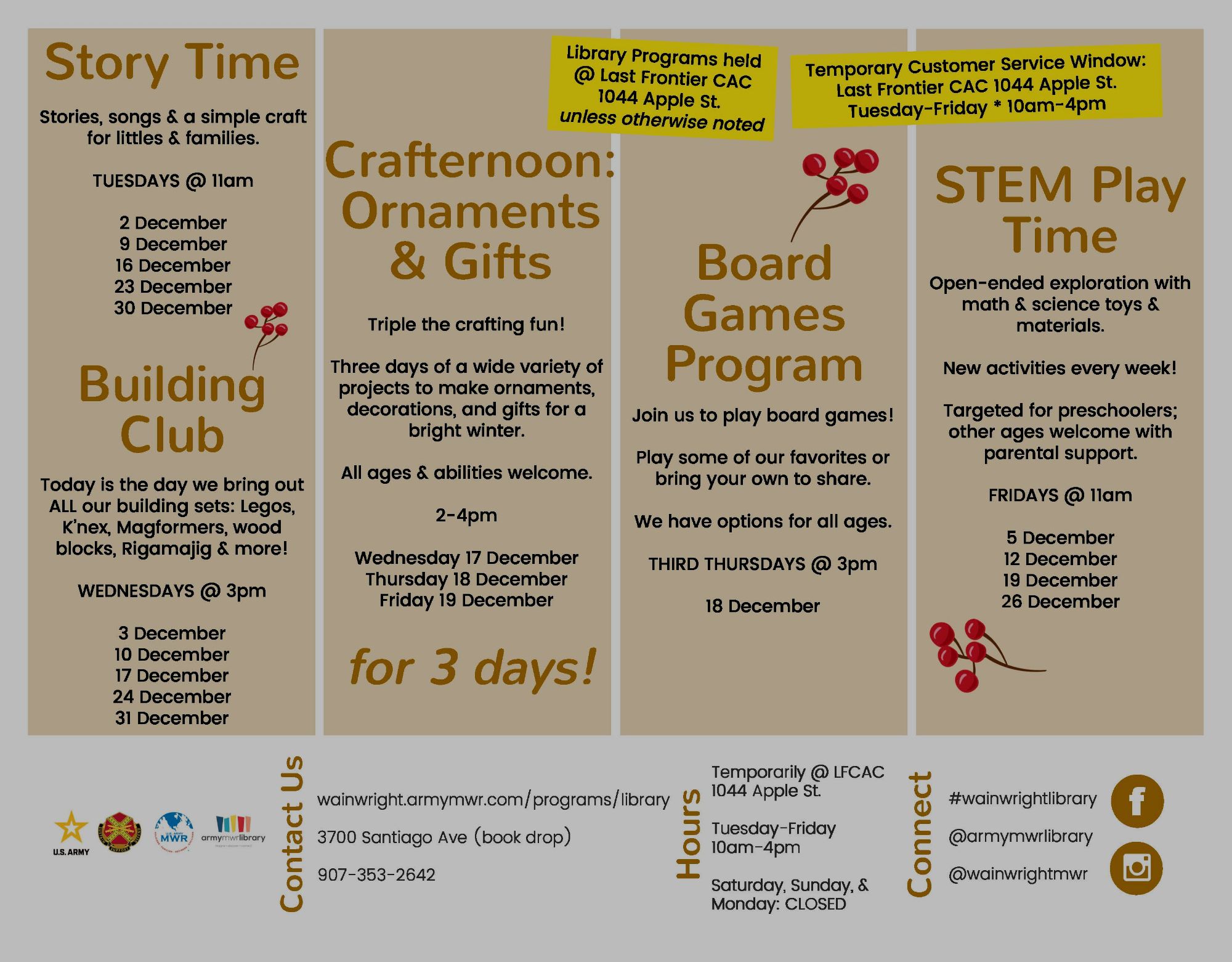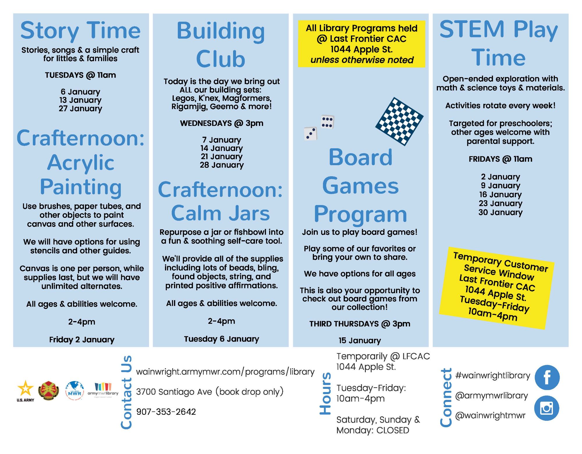 Please check out the MWR Calendar https://wainwright.armymwr.com/calendar for any changes to this calendar or updated information regarding the events listed here.