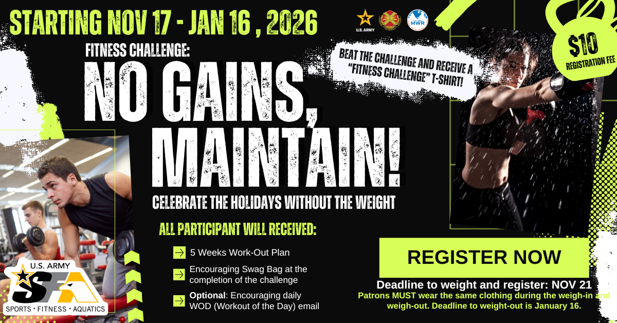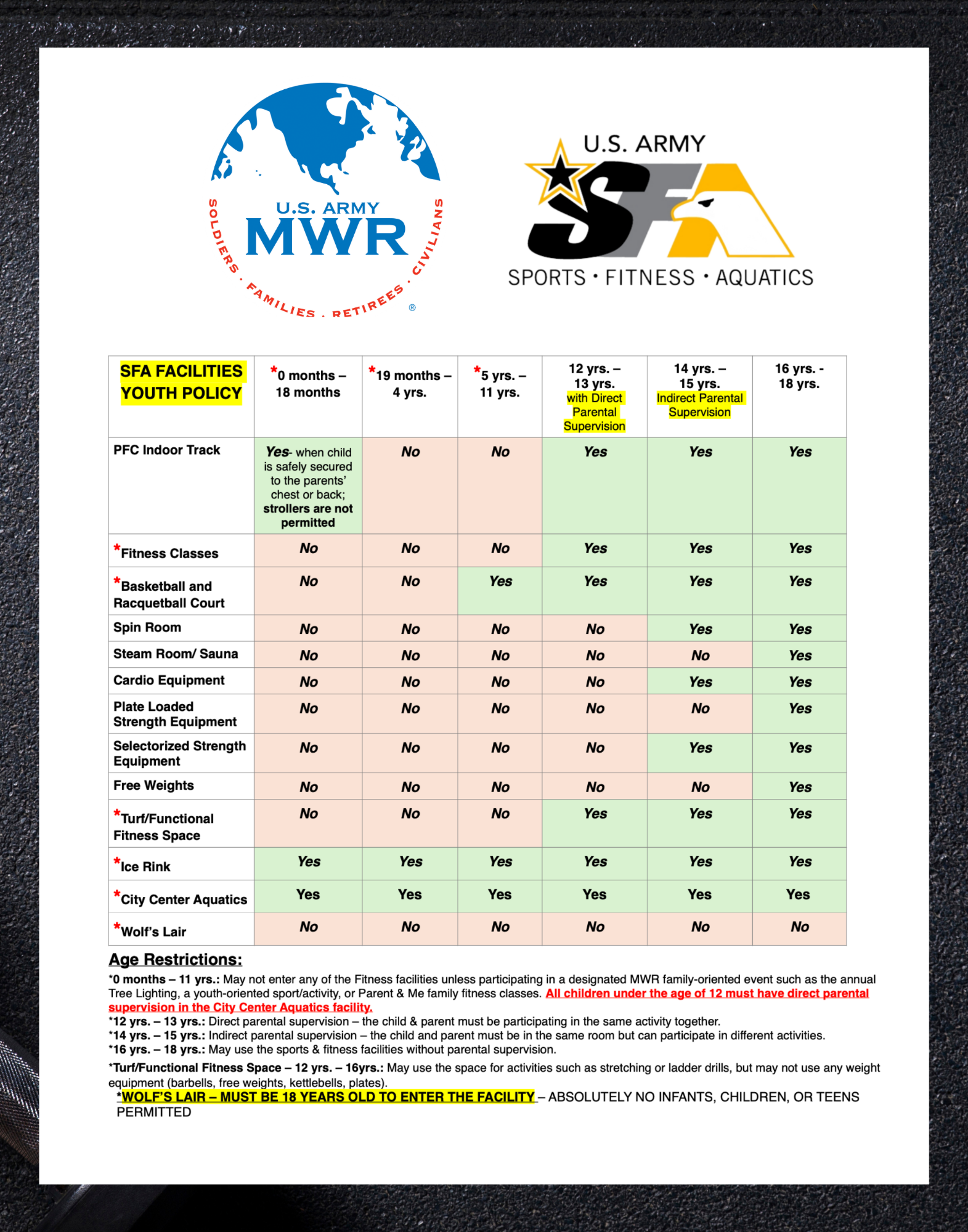 Sports & Fitness Center use is free and open to all eligible Family and MWR authorized users (16 and older), including retirees and family members.